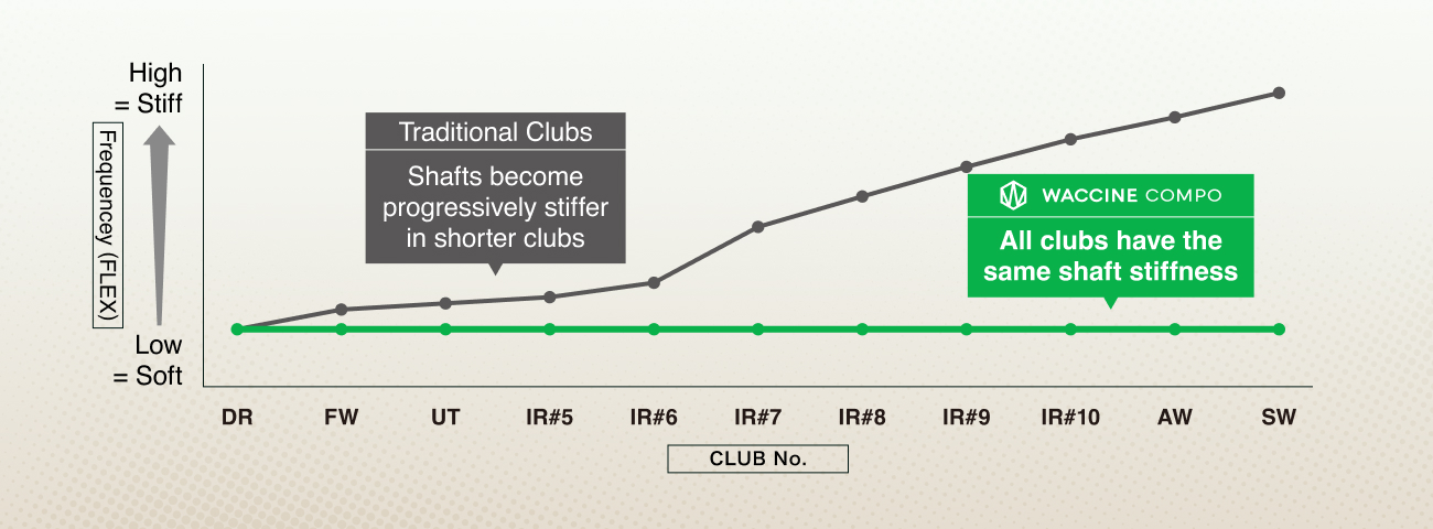 By intentionally standardizing shaft flex (frequency) across all club types, this design achieves consistent swing feel and improved shot stability. This innovative approach challenges traditional industry norms, embodying WACCINE Compo's unique golf philosophy.