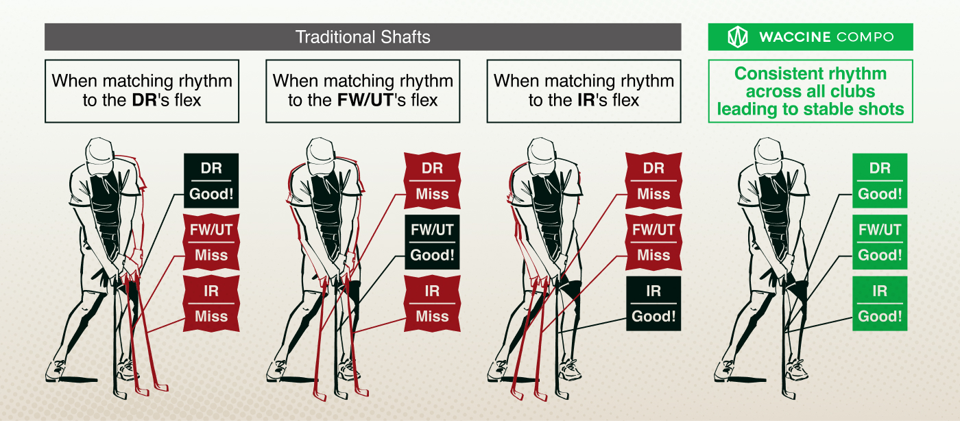 WACCINE COMPO was born from a desire to address the challenges observed in golf shafts over years of experience in the industry. Traditionally, lighter shafts are easier to swing but can lead to decreased accuracy, while heavier shafts improve accuracy but may reduce head speed.