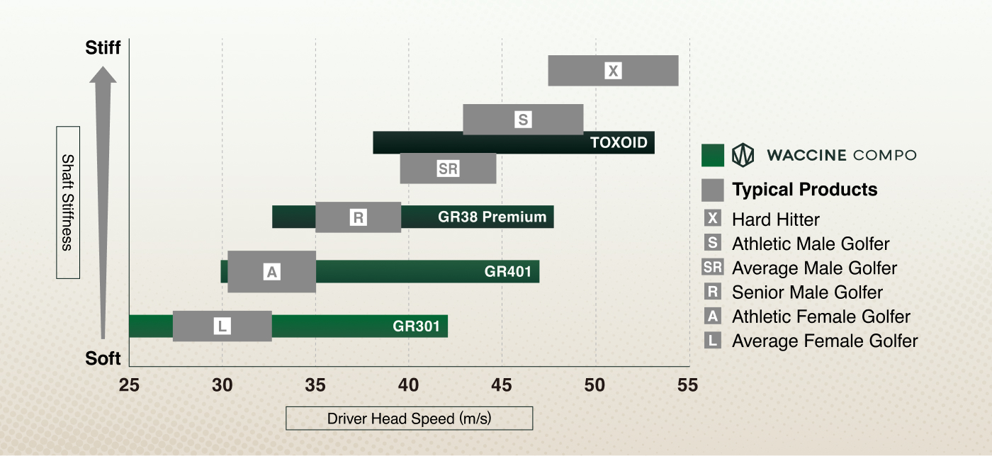 WACCINE COMPO offers a diverse range of shafts designed to deliver the exhilarating sensation of distance to golfers of all levels. From soft to hard hitters, we provide shafts suited to various head speeds, ranging from 25 to 53 m/s.